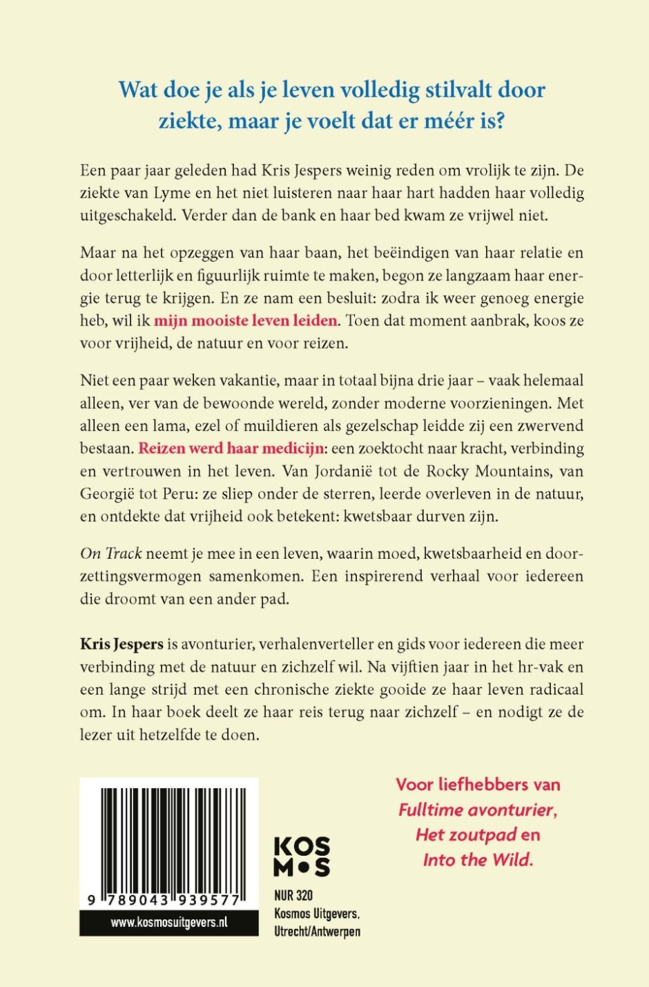 Een paar jaar geleden had Kris Jespers weinig reden om vrolijk te zijn. De ziekte van Lyme en het niet luisteren naar haar hart hadden haar uitgeschakeld. Verder dan de bank en haar bed kwam ze vrijwel niet. In On Track vertelt Kris over haar worstelingen en hoe ze de wereld ontdekt en haar mooiste leven leidt. Ze begint in Nederland, maar maakt al snel een reis door Jordanië met haar ezel. Vervolgens trekt ze ruim 1000 kilometer door Georgië, reist per kano door Zweden, fietst door Vietnam, Laos, Thailand en Maleisië, en loopt met twee lama’s door Peru om vervolgens te dwalen door Bolivia en Brazilië. En belandt uiteindelijk via Nieuw-Zeeland in de Rocky Mountains van Amerika met muildieren en paarden.
