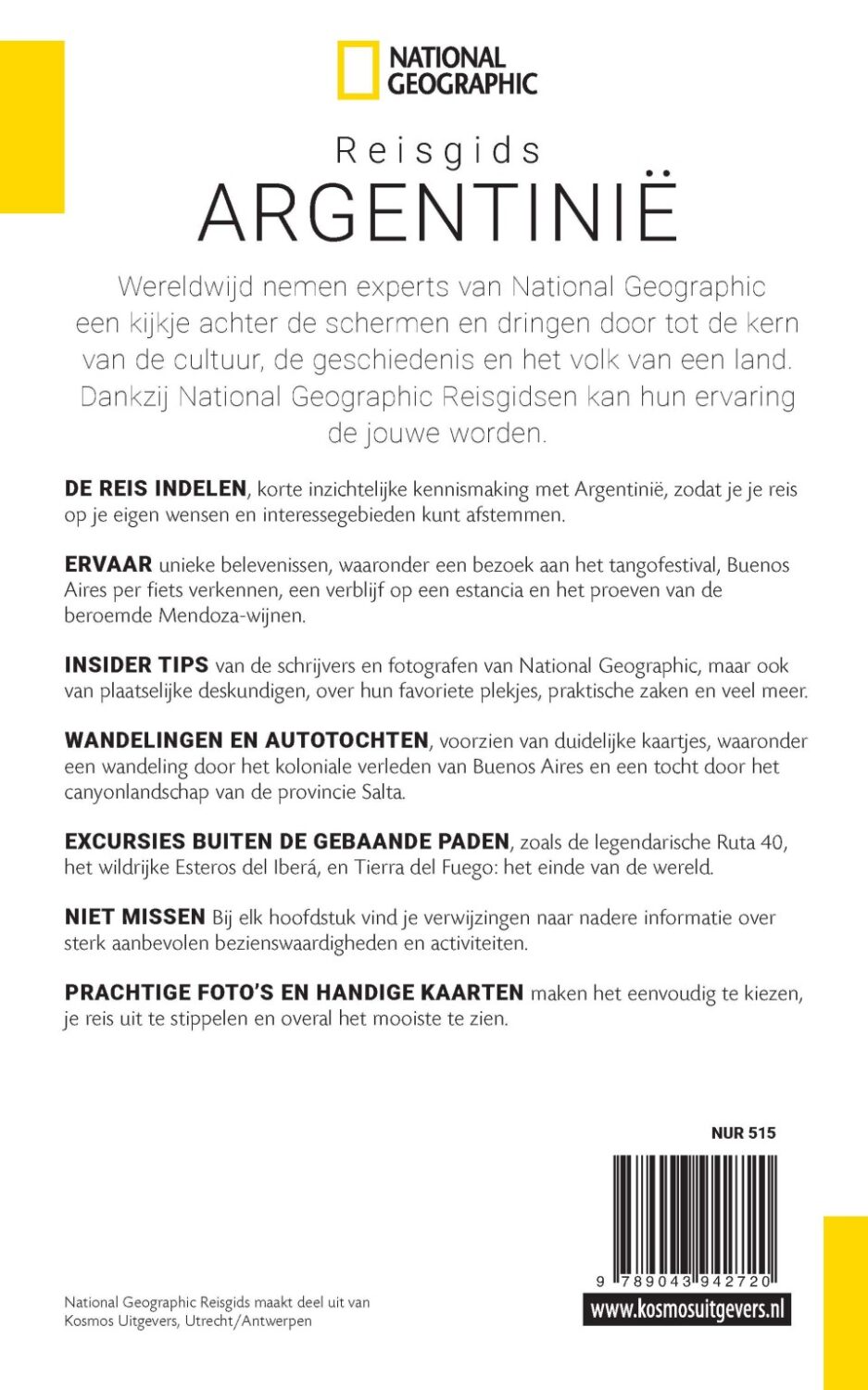 National Geographic Reisgids Argentinië is een exclusieve gids met sublieme fotografie die u meeneemt naar de bekende en minder bekende bezienswaardigheden. De experts van National Geographic nemen een kijkje achter de schermen en dringen door tot de kern van de cultuur, de geschiedenis en bijzondere plekjes van het land.