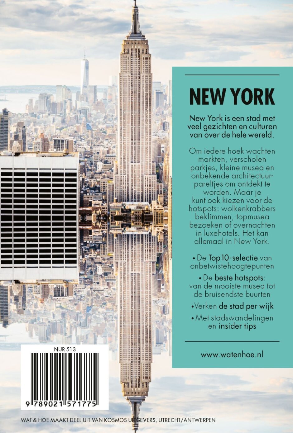 Wat & Hoe Stedentrip New York bevat de Top 10 hoogtepunten van New York, gedetailleerde uitklapkaarten en de beste hotspots voor je vakantie. Met alle informatie die je nodig hebt, plus insider tips voor overnachten, eten en uitgaan. Wat & Hoe Stedentrip New York is handzaam, compleet en betrouwbaar. New York is een stad met veel gezichten en culturen van over de hele wereld. Om iedere hoek wachten markten, verscholen parkjes, kleine musea en onbekende architectuurpareltjes om ontdekt te worden. Maar je kunt ook kiezen voor de hotspots: wolkenkrabbers beklimmen, topmusea bezoeken of overnachten in luxehotels. Het kan allemaal in New York.