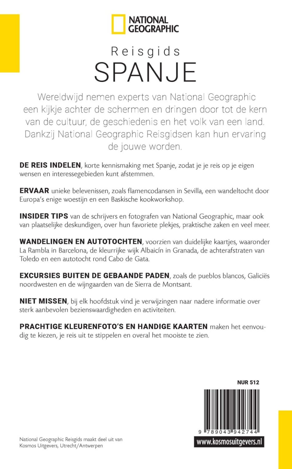 Bezoek met deze National Geographic Reisgids Spanje de pueblos blancos, Galiciës noordwesten en de wijngaarden van de Sierra de Montsant. Ga flamenco dansen in Sevilla, maak een wandeltocht door Europa's enige woestijn en volg een Baskische kookworkshop. maak een wandeling over La Rambla in Barcelona, door de kleurrijke wijk Albaicín in Granada en door de achterafstraten van Toledo.