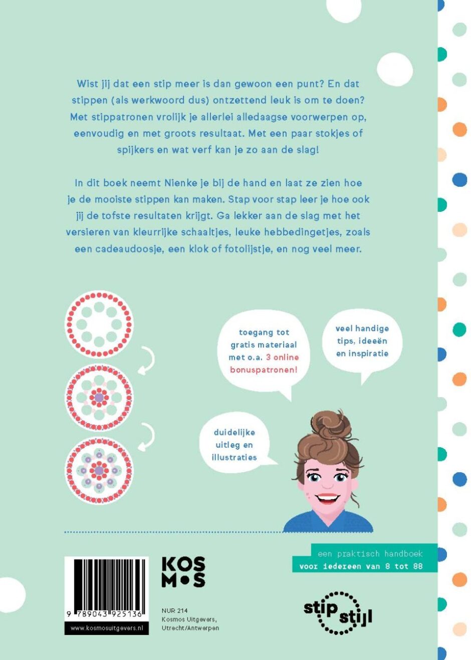 In het boek Stippen. de kids editie laat Nienke van der Zwan (@stipstijl op Instagram) zien hoe leuk en makkelijk het is om met verf en een paar stokjes unieke stippatronen te maken op allerlei ondergronden. Nienke neemt je bij de hand en laat stap voor stap zien hoe je de tofste resultaten krijgt. Ga lekker aan de slag met het versieren van happy stones, leuke hebbedingetjes, zoals een cadeaudoosje, een klok, een mok, fotolijstje en nog veel meer. Houden jouw kinderen van precisiewerkjes of creativiteit, dan zullen zij al snel ontdekken hoe leuk en ontspannend stippen is. Pas maar op dat ze niet verslaafd raken – of dat je er zelf aan begint!