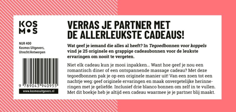 Dit bonnenboek bevat 25 lieve en grappige tegoedbonnen: van een zoen tot een nachtje weg en van een droomdate tot een complimentenregen. Geef originele ervaringen, klein en groter, en maak onvergetelijke herinneringen met je geliefde. Drie bonnen zijn blanco om zelf in te vullen. Met dit boekje heb jij altijd een cadeau dat in de smaak valt.