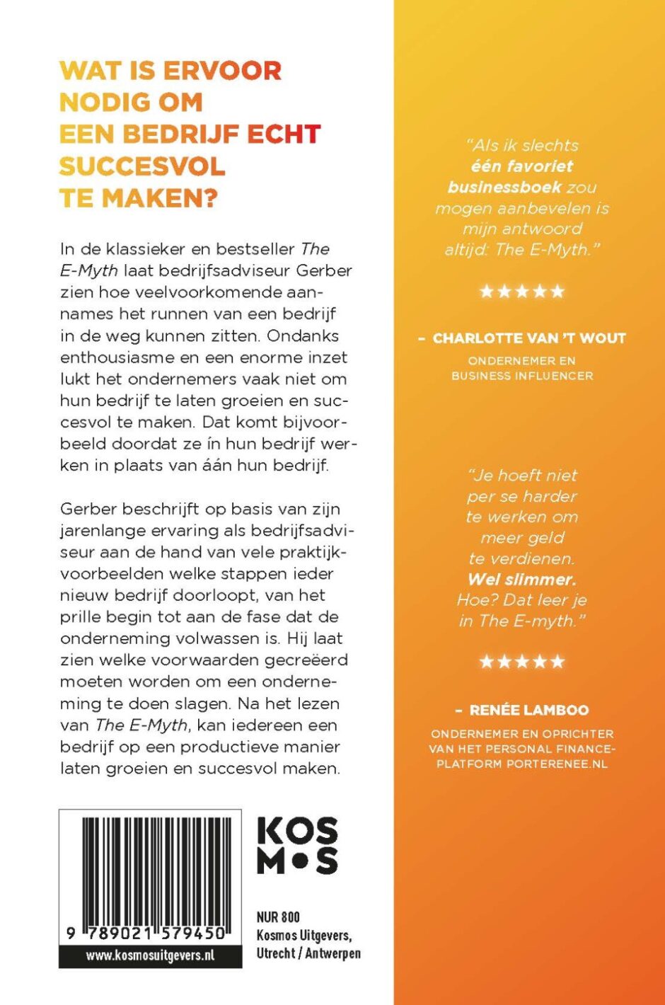 In de instantklassieker­ The E-Myth laat bedrijfsadviseur Gerber zien hoe veelvoorkomende aannames het runnen van een bedrijf in de weg kunnen zitten. Ondanks een enorme inzet lukt het veel ondernemers niet om hun bedrijf te laten groeien en succesvol te maken. Dat komt bijvoorbeeld doordat ze ín hun bedrijf werken in plaats van áán hun bedrijf. Gerber beschrijft op basis van zijn jarenlange ervaring als bedrijfsadviseur aan de hand van vele praktijkvoorbeelden welke stappen ieder nieuw bedrijf doorloopt, van het prille begin tot aan de fase dat de onderneming volwassen is. Hij laat zien welke voorwaarden gecreëerd moeten worden om een onderneming te doen slagen. Na het lezen van The E-Myth, kan iedereen een bedrijf op een productieve manier laten groeien en succesvol maken.