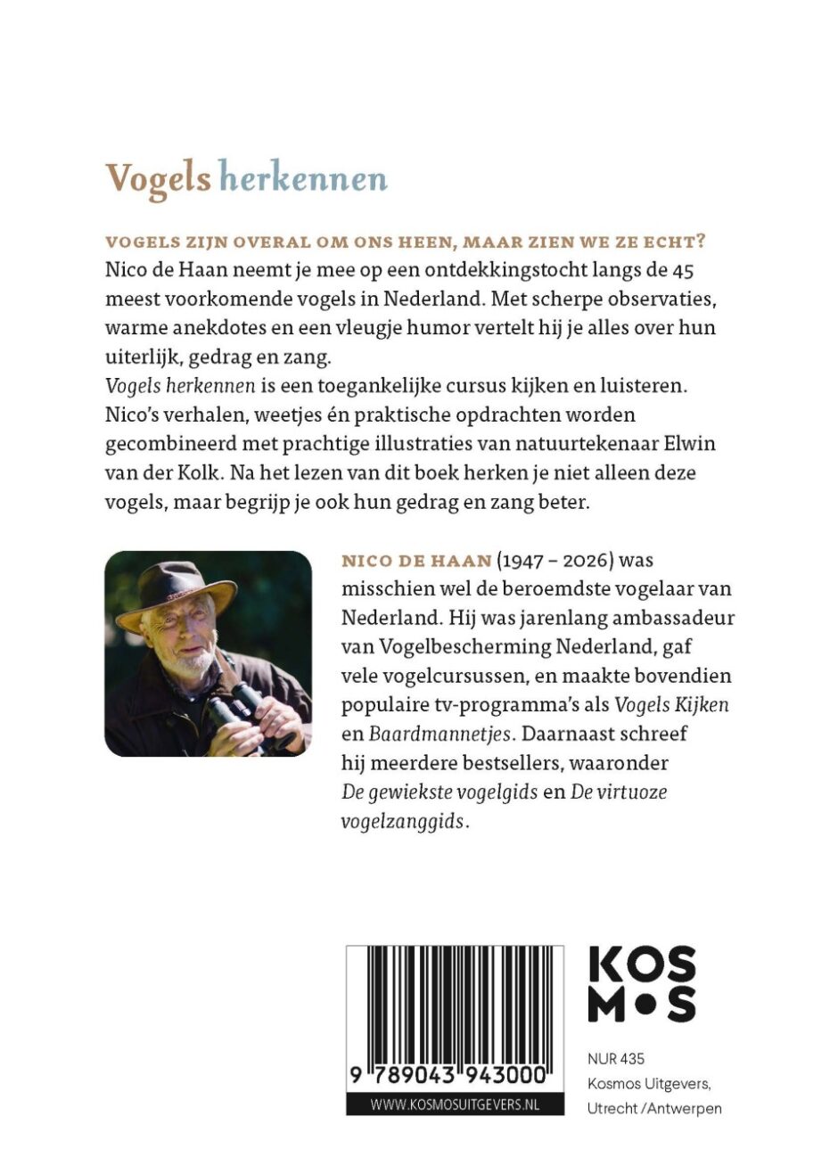In Vogels herkennen behandelt Nico de Haan de 45 meest voorkomende vogels en geeft hij inzicht in bijzondere gedragingen. Hierdoor leer je vogels beter herkennen en begrijpen. Nico brengt vogels dichterbij aan de hand van verhalen vol kennis, humor en verrassende weetjes. Geen veldgids voor determinatie, maar een boek waarin je op toegankelijke wijze over de eigenschappen van een vogel leert, en waarin Nico laat zien waar je op moet letten. Het boek richt zich vooral op visuele herkenning, terwijl de audiovariant geluidsfragmenten bevat die de zang onderstrepen. Leer vogels zien én horen!