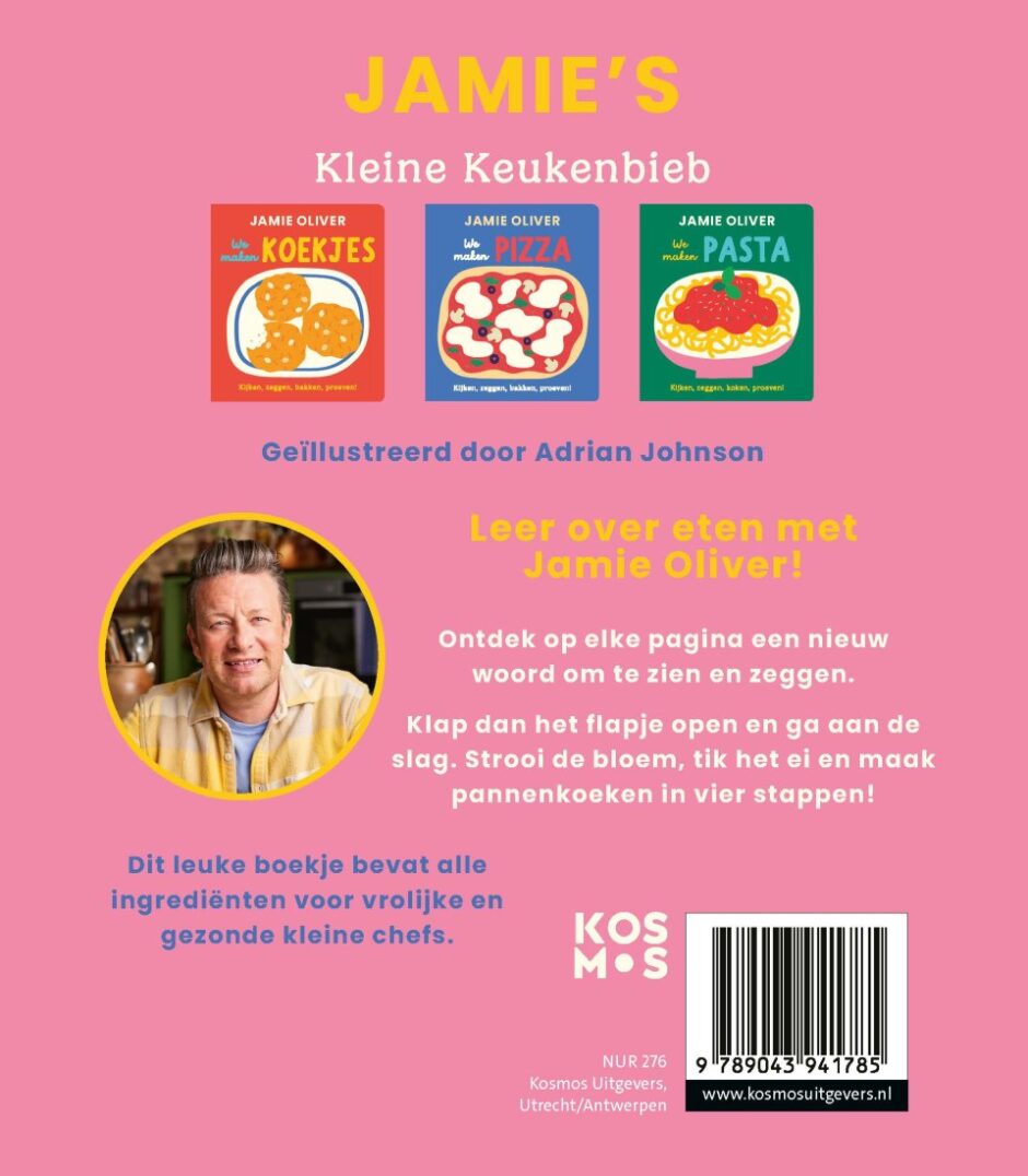 Met Jamie’s Kleine Keukenbieb ontdekken kinderen spelenderwijs de wereld van eten en koken. In vrolijke kartonboeken neemt Jamie Oliver de allerkleinsten mee in herkenbare recepten als pannenkoeken, pizza en pasta. Met flapjes, kleurrijke illustraties en stap-voor-stap uitleg leren kinderen nieuwe woorden, wordt hun nieuwsgierigheid naar eten gewekt en beleven ze plezier aan samen koken. Zo legt Jamie al jong de basis voor een gezonde relatie met voeding.